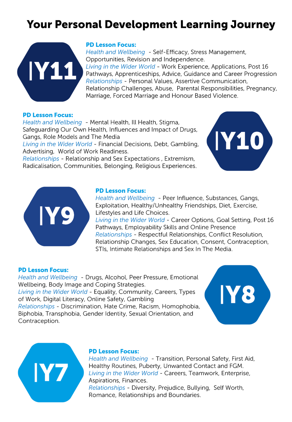 The Personal Development curriculum will focus on the key areas with direct links to various statutory topics. The Personal Development curriculum is sequential, interleaved and progressive over a student’s life at Halewood Academy so they continually revisit areas whilst further developing the powerful knowledge associated with the topics. Halewood Academy students will explore the following areas:
