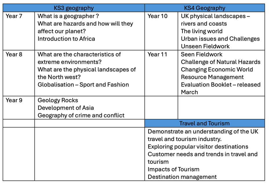 Delivering a wide range of both human and physical geography with emphasis on core subject knowledge.
